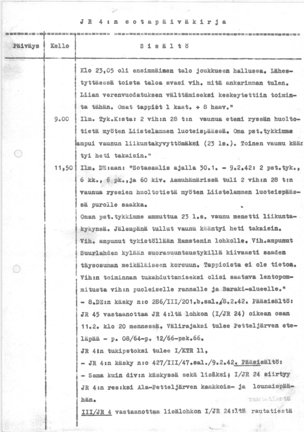 Sotapäiväkirja 9.2.1942 Propsipinot muodostavat viholliselle erinomaisen suojan. Tarvittaisiin jatkuva raskaan tykistön tulta sekä paloammuksia. Muutoin vihollisen karkottaminen olisi vaikeata.