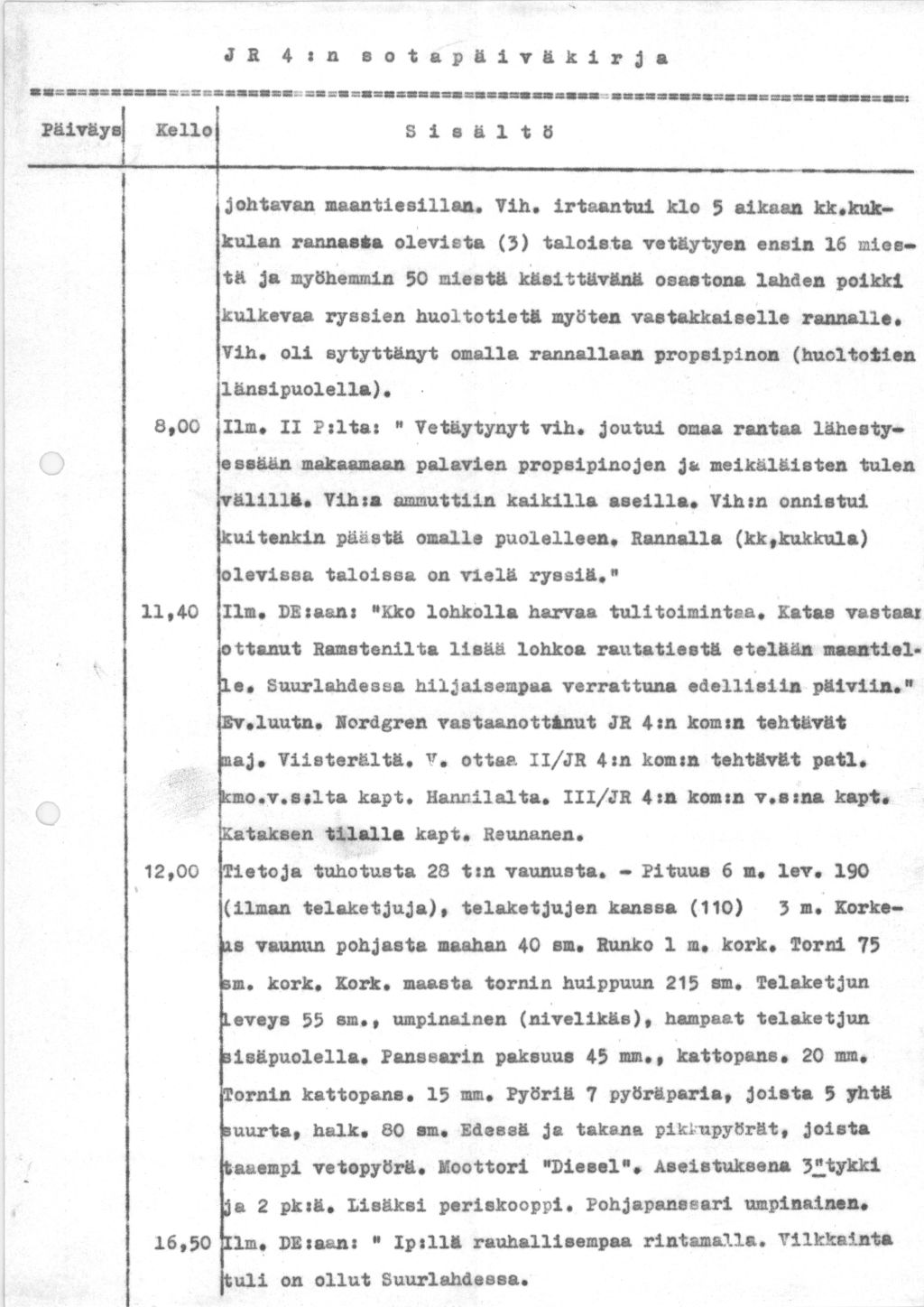 "Kinkijeva Rutsista pohjoiseen pidätettiin eilen suomalaiseen sotilaspukuun pukeutunut nainen, joka kuuluu Laatokan rannikolle 13.6. maihin laskettuun 8-henkiseen (7 miestä + 1 nainen) partioon. Aseistus: 2 konepistoolia + 6 saksalaista kivääriä + 2 käsikranaattia. Varustus: kaikilla suomalaiset sotilaspuvut. Tehtävä: liikenteen tiedusteleminen teillä ja Muurmannin radalla. Partiolla radio, mutta vangittu nainen väittää olevansa ainoa radisti. Partion johtaja: kersantti Takmatshev. - - Eilen tapettiin Karjalan ja Sammatuksen välillä 2 omaa miestä pistimellä (pää toiselta miltei irti ruumiista). Luultavaa, että partio jatkaa matkaa itään."