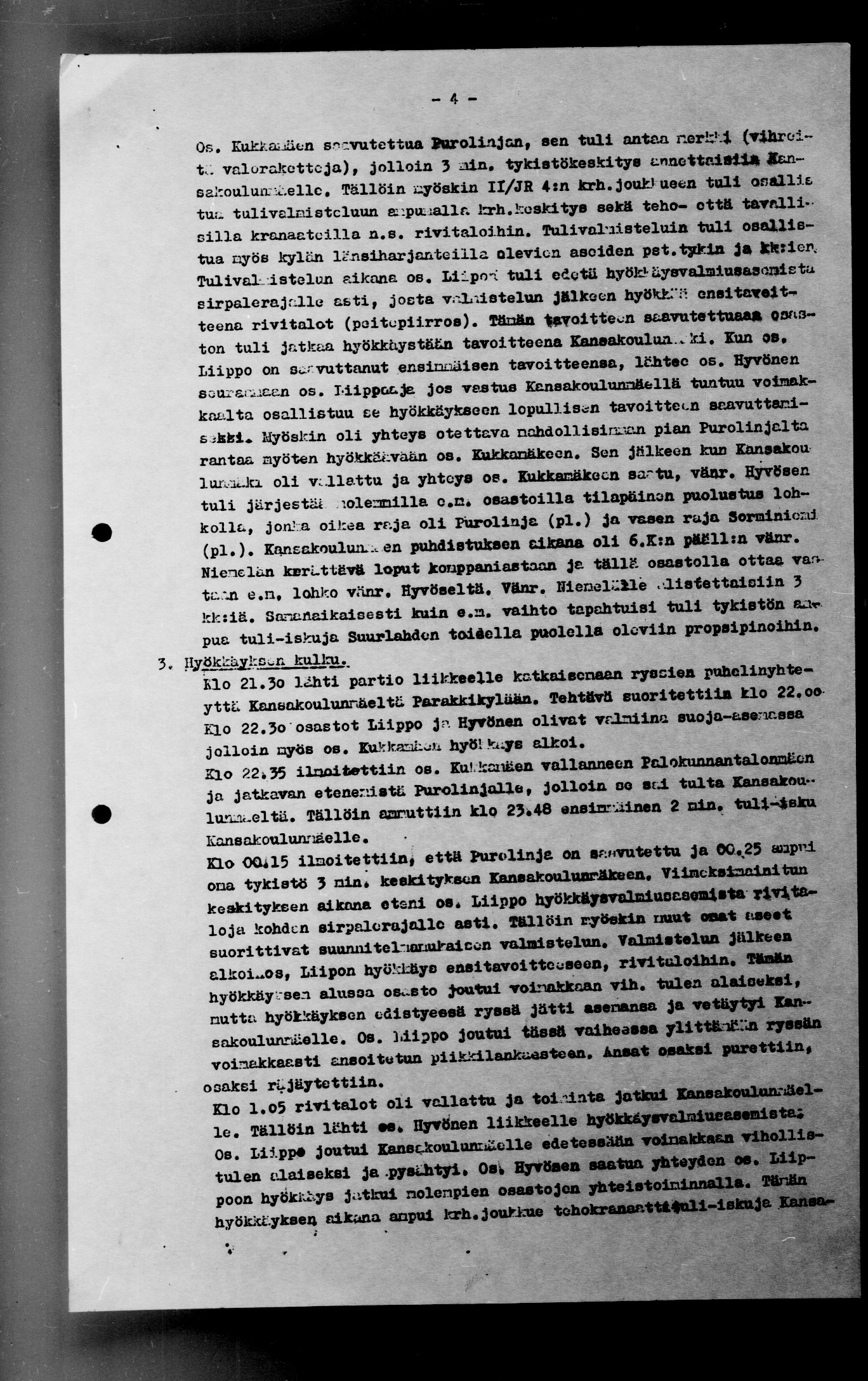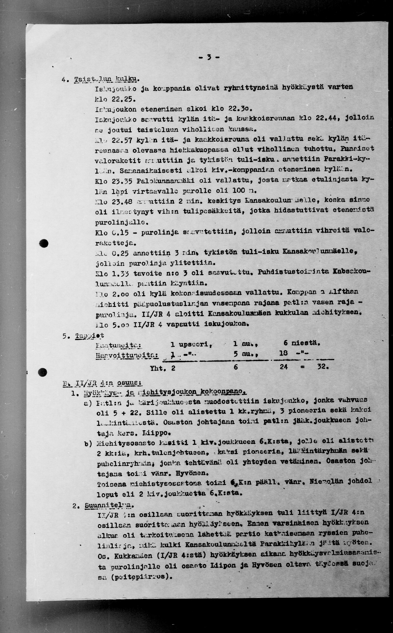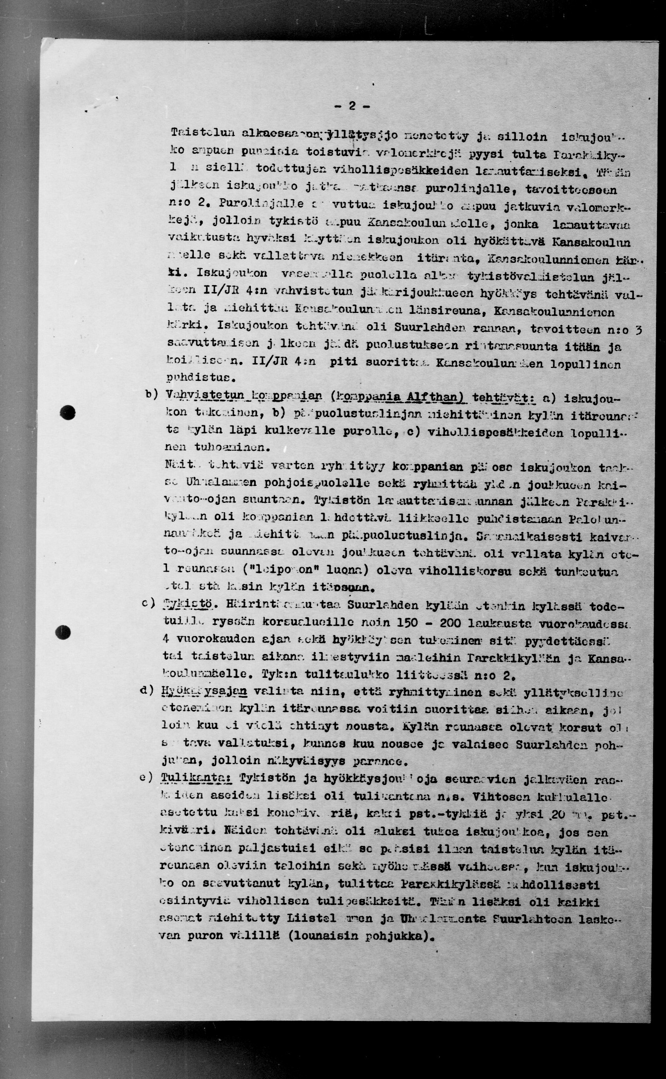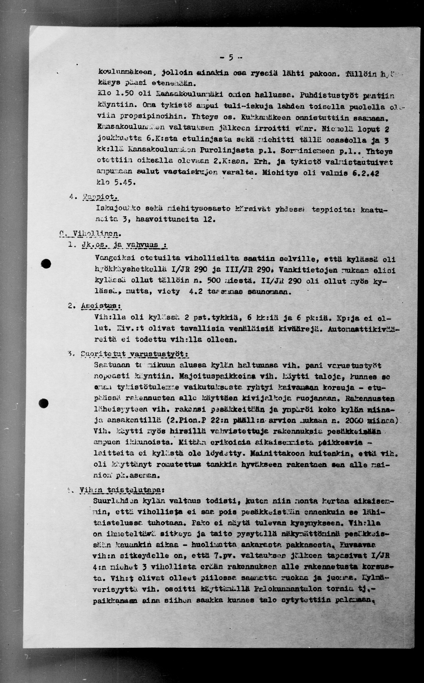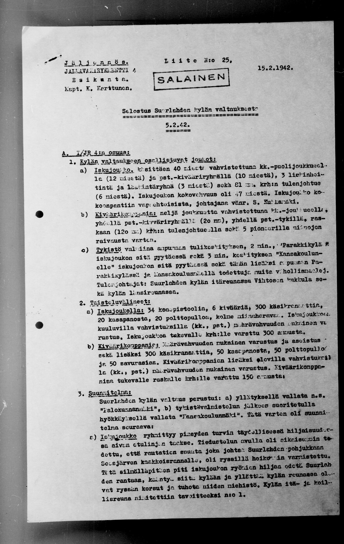 Ote kapteeni K. Karttusen JR4: esikunnassa laatimasta raportista "Selostus Suurlahden kylän valtauksesta 5.2.42":