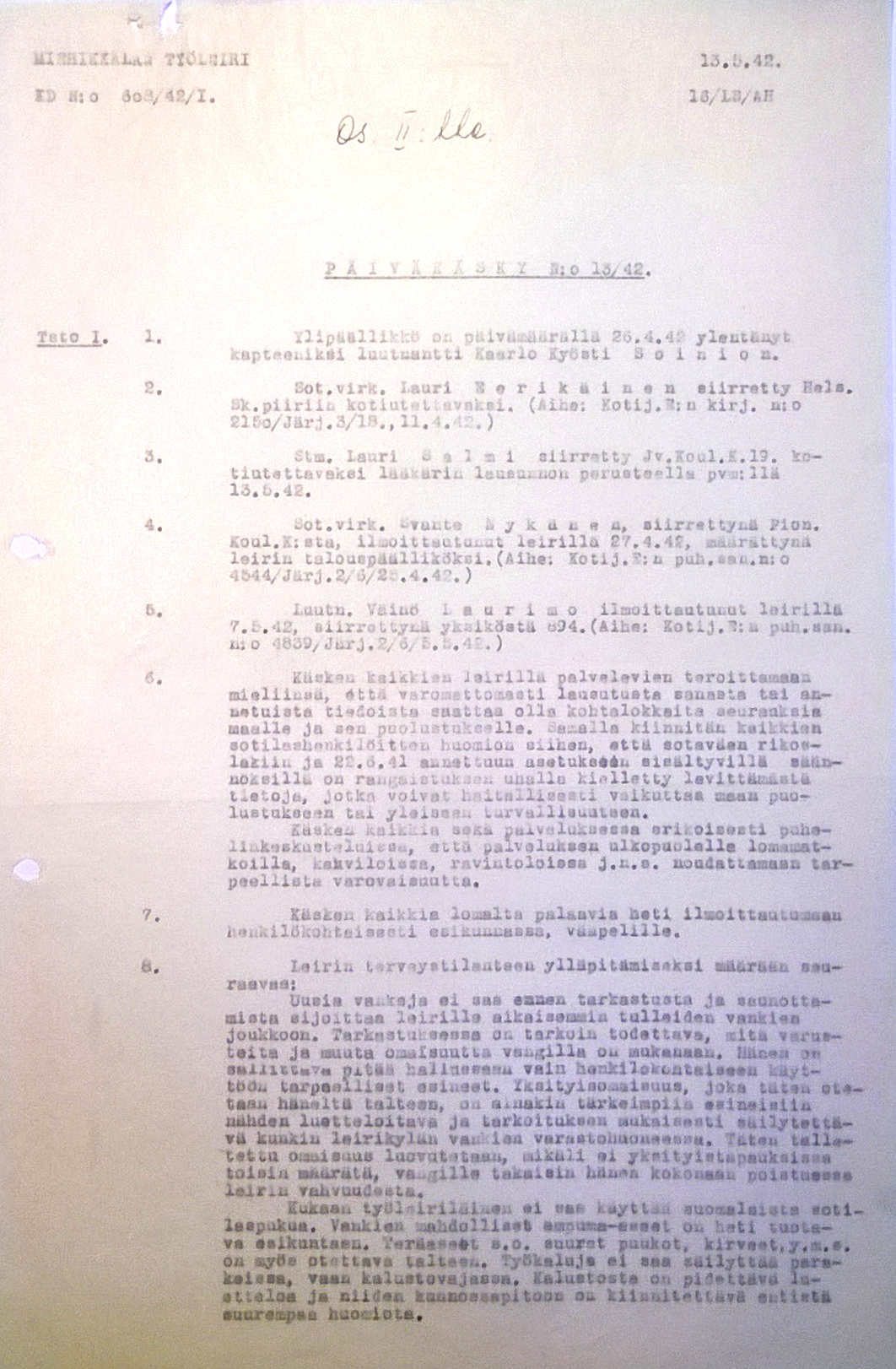 Miehikkälän työleirissä oli kaksi lasta hukkunut, minkä johdosta työleirin päällikkö kapteeni K. Soinio määräsi, että lasten uimarannalle on asetettava valvoja. Päiväkäsky annettu 13.5.1942. Sivu 1 ja sivu 2, jälkimmäisen kohdan 8 viimeinen kappale: