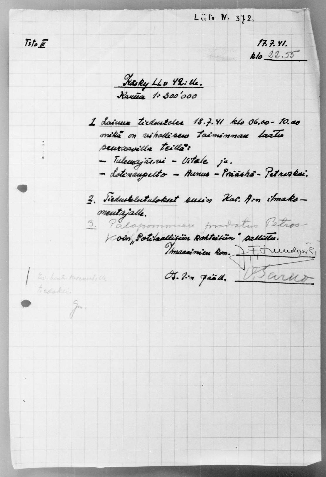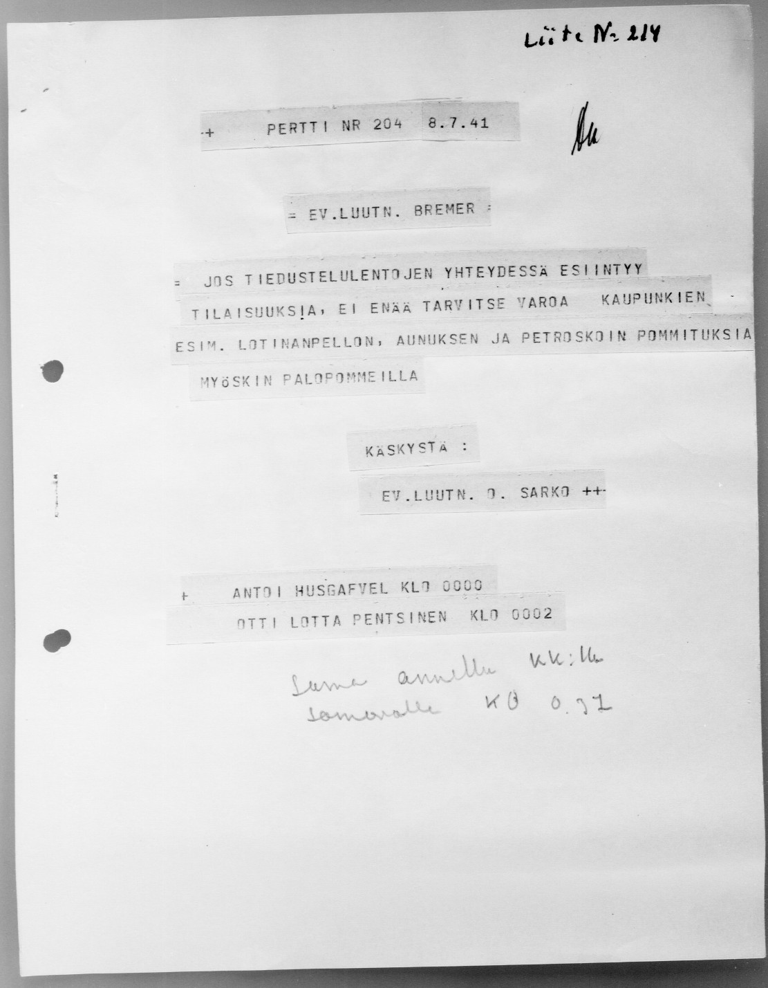 Viikkoa myöhemmin Lentolaivue 42:lle annettu käsky oli jo hieman täsmällisempi. Ilmavoimien komentaja painotti, että pommituslupa koski Petroskoin "sotilaallisia kohteita".